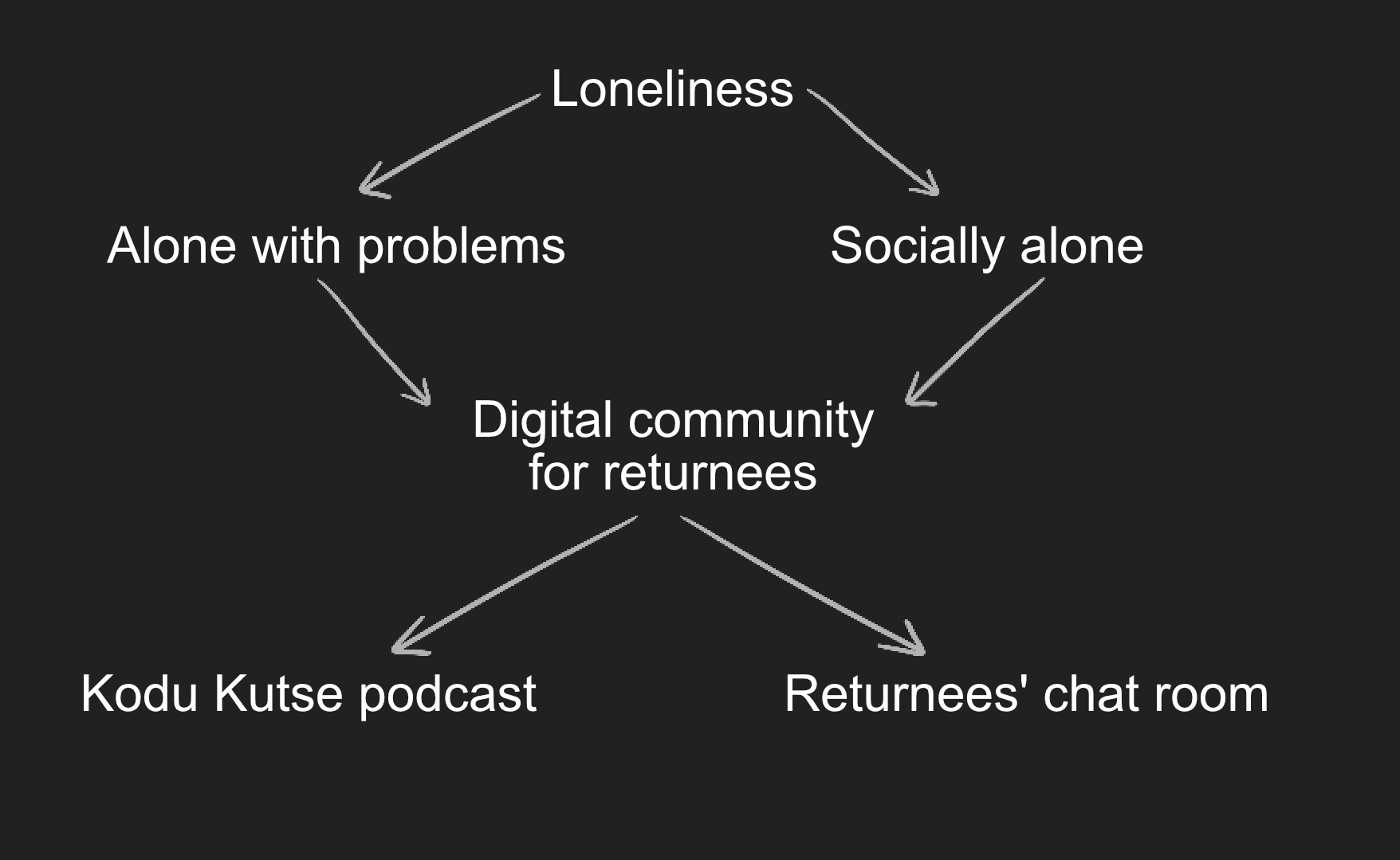 As a result of our research, we discovered that one of the biggest obstacles to returning is loneliness, which takes two forms. One is being alone with problems, and the other is loneliness as socially alone.