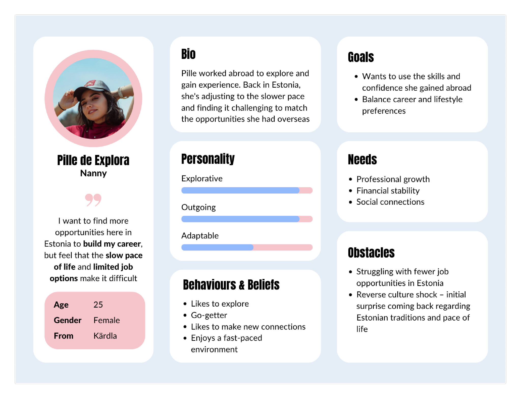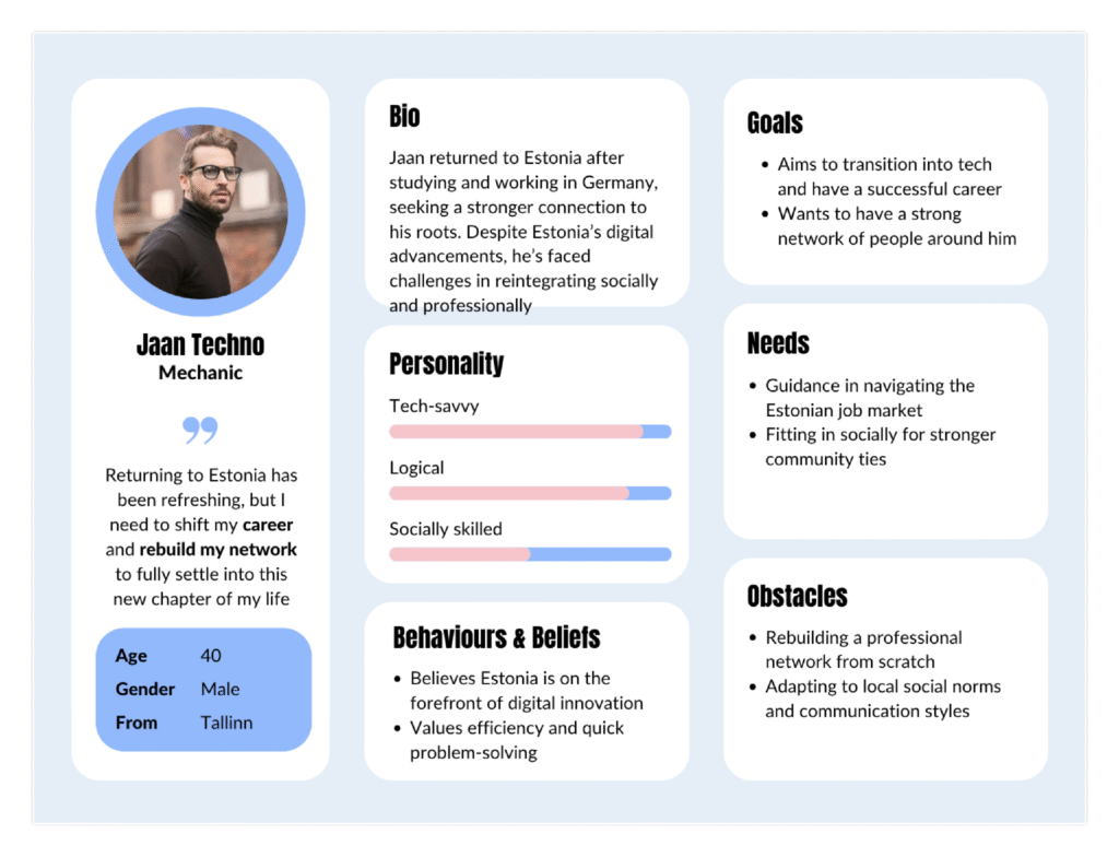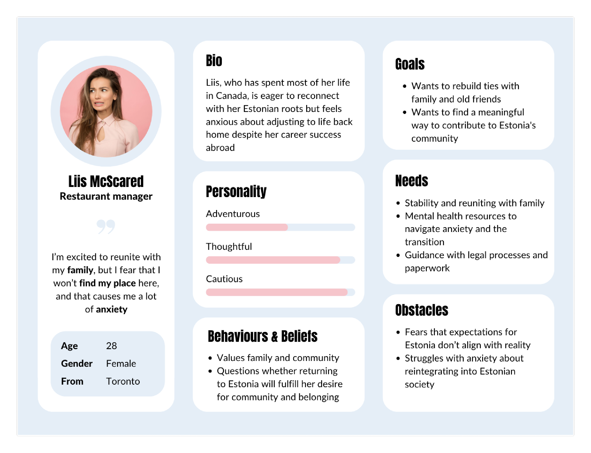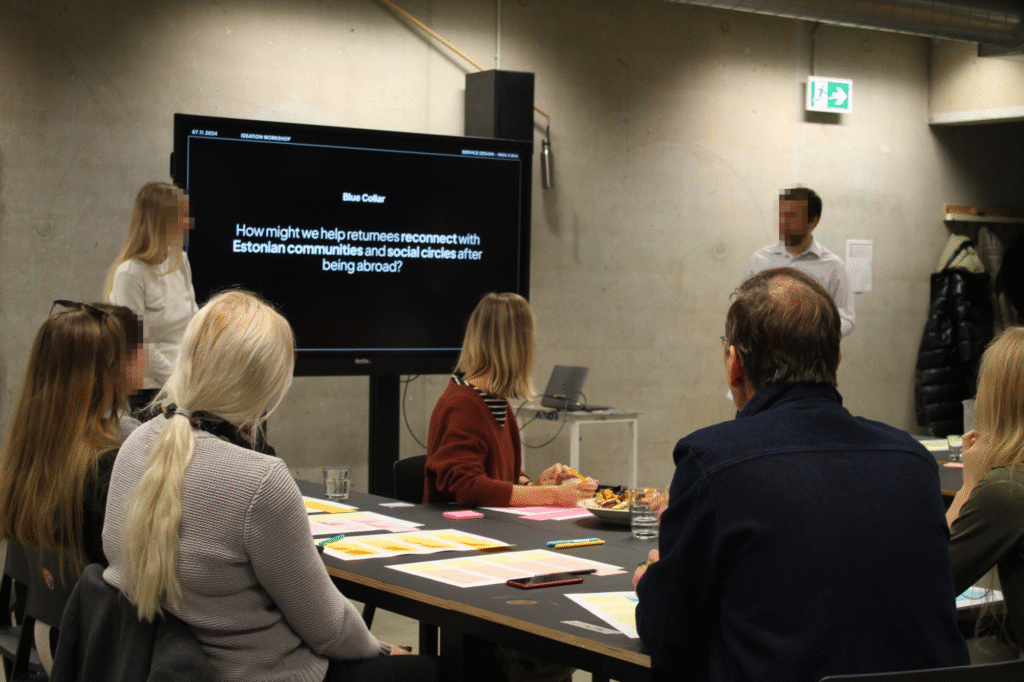 Oma projekti täpsema fookuse seadmiseks tegime 2 töötuba. Esimene töötuba oli väiksem, kus osales 2 tagasipöördujat ja meie 3 tiimiliiget kehastamas me kolme persoonat. Töötuba tõi me tähelepanu sellele, et kõige suuremat mõju kogu teekonnal ei avalda mitte probleem info leidmise ja dokumentide vormistamisega, vaid hoopis üksindus ja eraldatuse tunne.