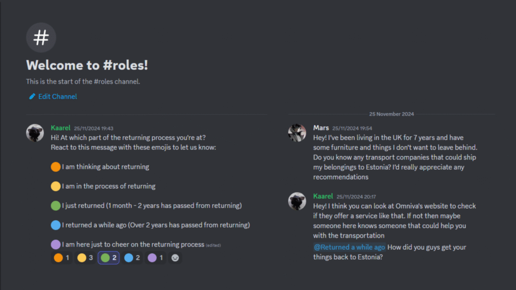 Rollide määramine käib lihtsalt sõnumile reageerides vastava värviga. Rolle on võimalik kasutada selleks, et suunata sõnumit kindlale sihtrühmale. Näiteks sedasi saavad uued tagasipöördujad küsida nõu vanematelt.