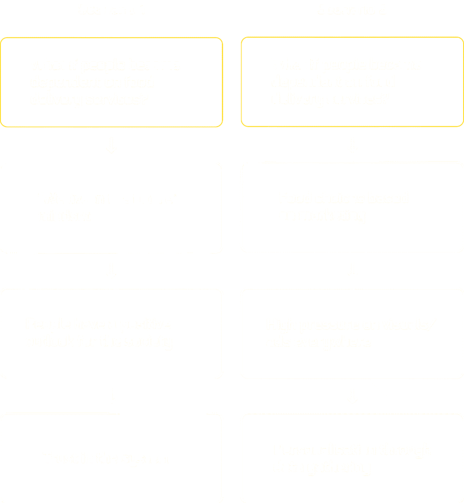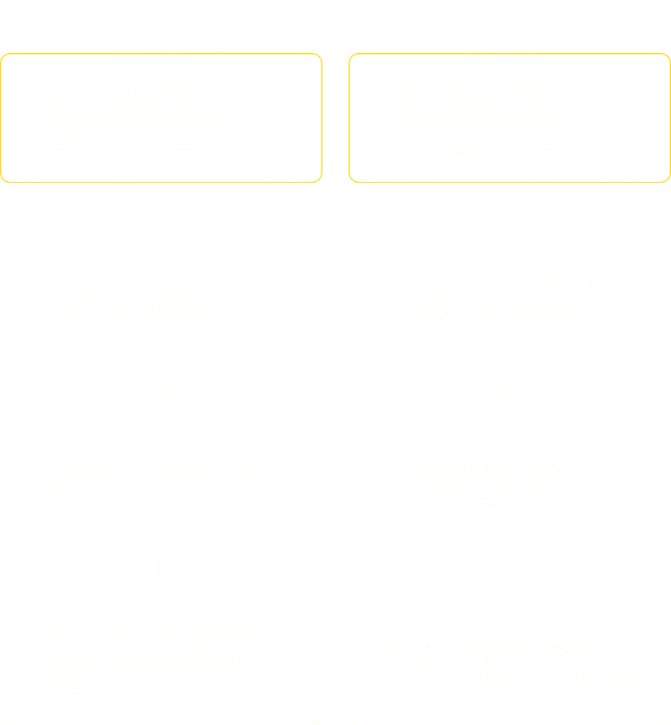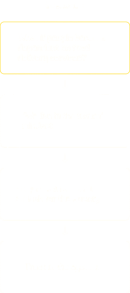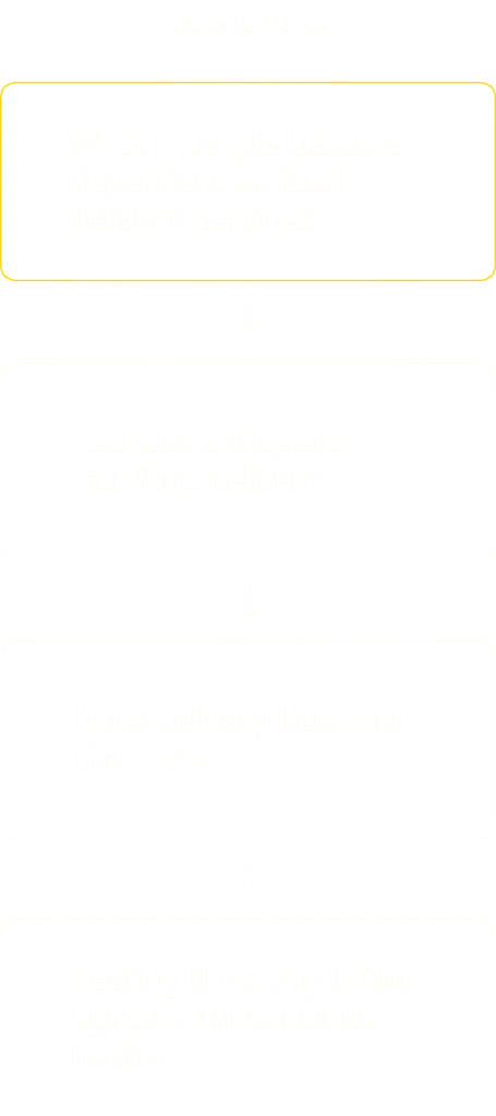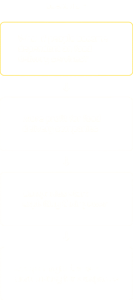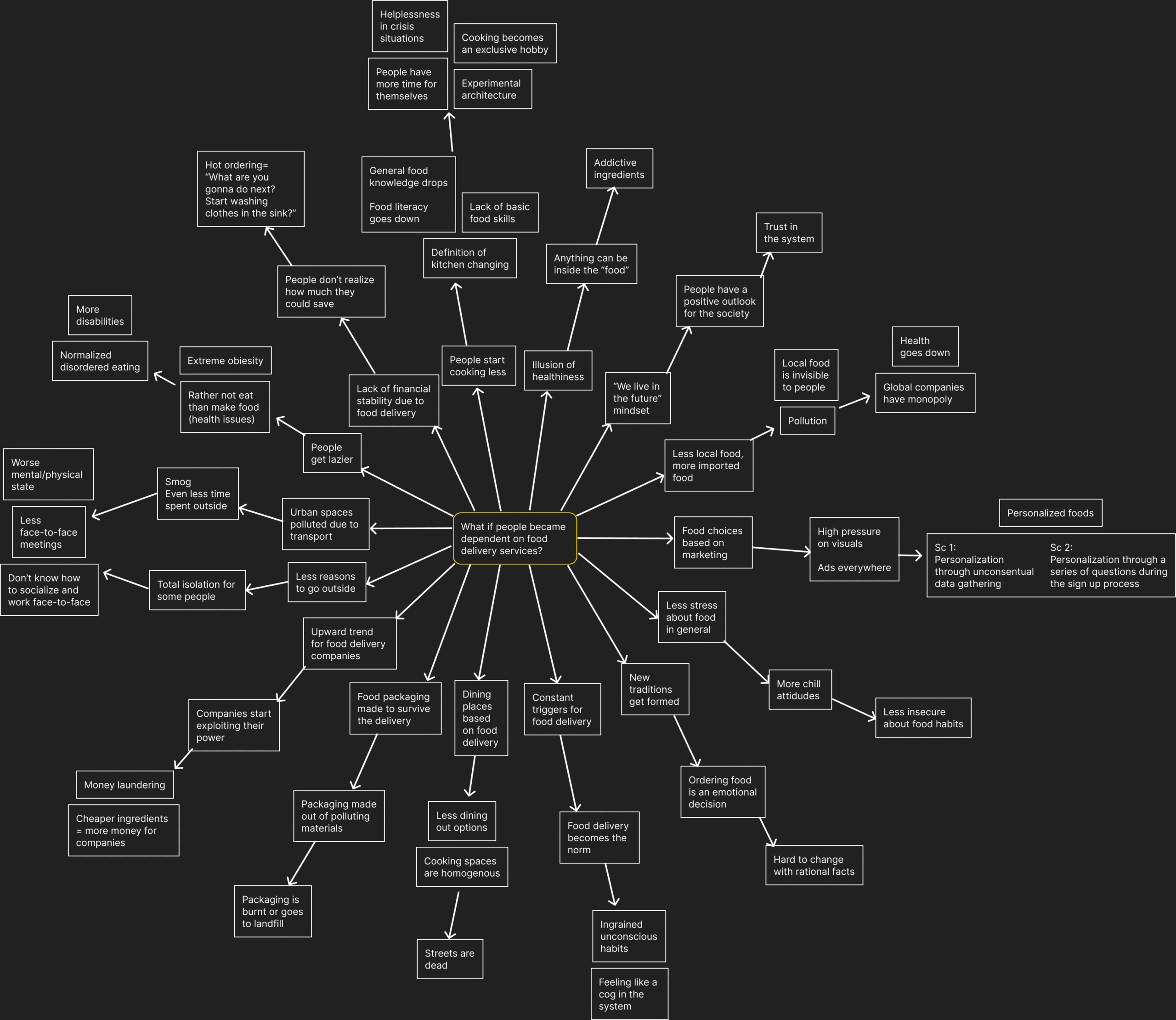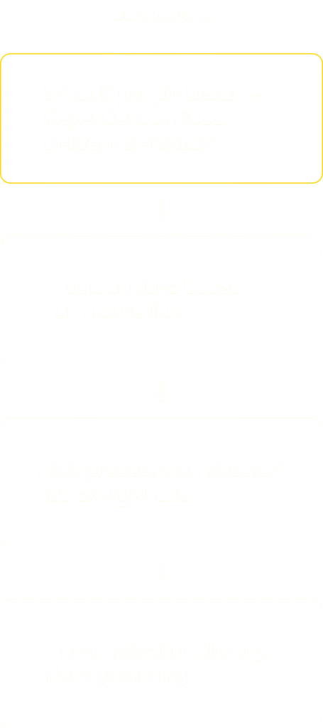 Potentsiaalse Eesti toidu tuleviku leidmiseks tegime tuleviku ratta. Tegu on ajarünnaku meetodiga, mille abil saab avastada mitmetel tasanditel tagajärgi, mis tulenevad erinevat tüüpi muutustest. Meie ratta keskne küsimus oli „Mis juhtuks kui inimesed hakkaks sõltuma toidukullerite teenustest?