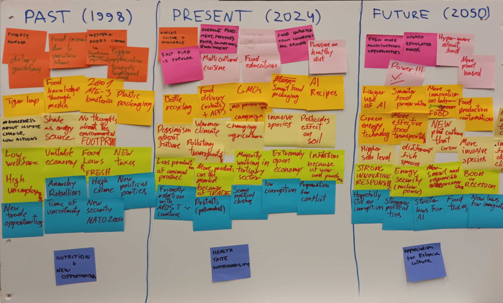 Selleks, et ette kujutada, milline võib olla Eestis inimeste suhe toiduga aastal 2050, pidime esmalt mõistma, milline oli inimeste suhe toiduga 25 aastat tagasi ja milline on see nüüd. Selle jaoks tegime sekundaarset uurimust ja viisime läbi intervjuusid eri vanustes inimestega. Intervjueerisime ka eksperte, et teada saada, milliseid trende on nemad märganud ja mis tulevikus võib toimuda.